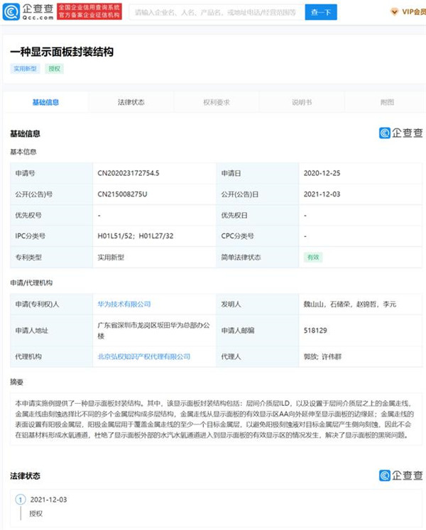 12 月 4 日消息,昨日,华为技术有限公司公开了“一种显示面板封装结构”专利,公开号为CN215008275U。