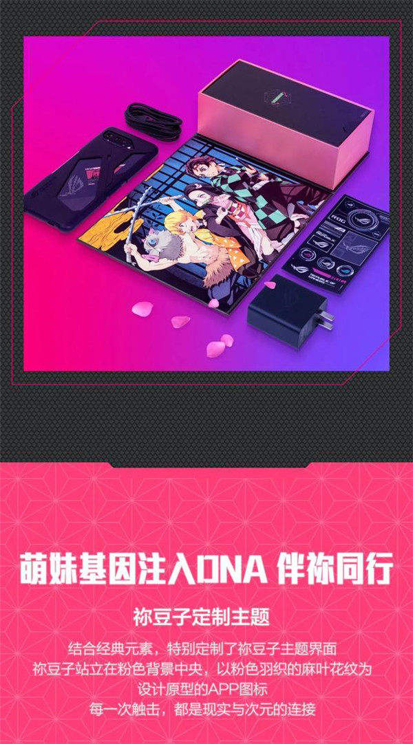整体包装方面,这款手机结合 ROG 经典黑与祢豆子和风粉的色调。包装盒外部,绘有祢豆子形象与鬼灭之刃 LOGO。另外,官方还定制了祢豆子的主题界面。