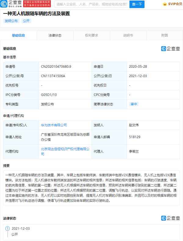 12月3日,企查查App信息显示,华为技术有限公司公开了一项新专利,名为“一种无人机跟随车辆的方法及装置”,公开号为CN113741506A。