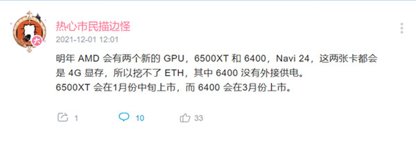 12 月 3 日消息,AMD 多款入门级显卡此前被曝光,型号为 Radeon RX 6500 XT、RX 6400。根据国内爆料者 @热心市民描边怪 在 B 站发表的动态,RX 6500 XT 将于 2022 年 1 月中旬上市,而 RX 6400 将于 2022 年 3 月上市。