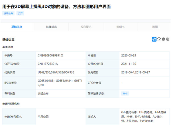 12 月 2 日消息,苹果公司在近日公开“用于在 2D 屏幕上操纵 3D 对象的设备、方法和图形用户界面”专利,公开号为 CN113728301A。