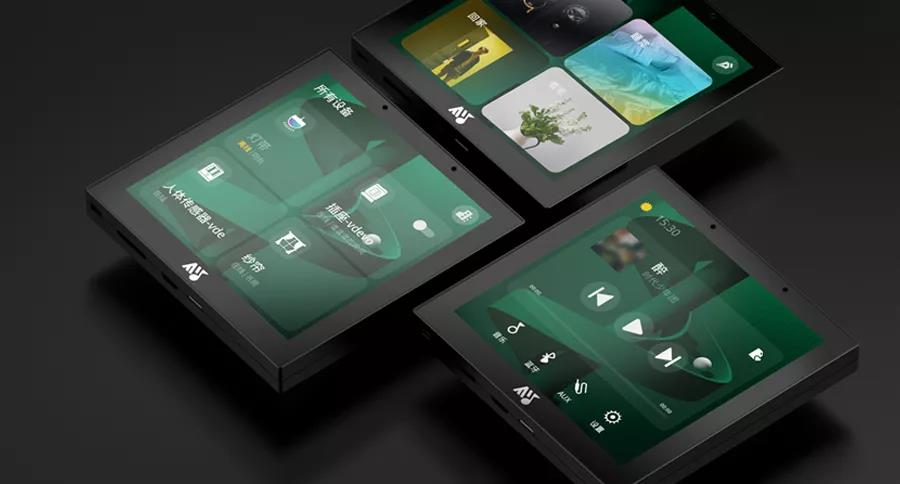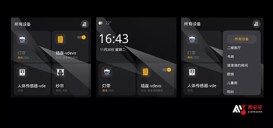首页、设备、场景、图标信息展示以卡片形式呈现,简单明了,操作一键直达;左屏设备开关图标突出显示,设备图标更饱满,使得模块层级区分明显;右屏场景界面图片背景形式,让右屏展示更美观。