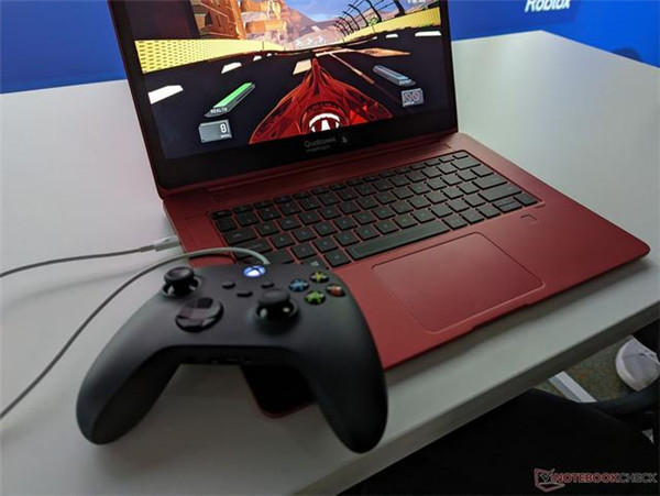 这款笔记本预计为 13.3 英寸,采用红色外壳,印有高通商标,还具有独立的指纹识别装置。图中可以看到,笔记本可以连接 Xbox 游戏手柄进行游戏,具有多个 Type-C 接口。官方表示,该芯片支持 USB 3.1 协议,最多能够连接两块 4K 显示器。