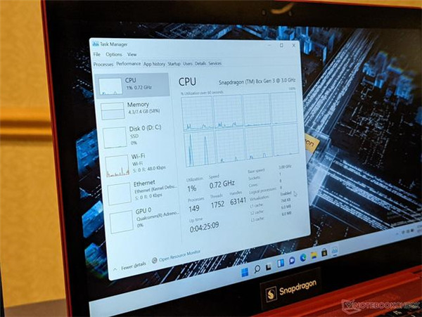这款笔记本装有 Windows 11 操作系统,从任务管理器看,笔记本配备 8GB 内存,CPU 主频 3.0 GHz。处理器在闲置时负载十分低,主频低至 0.72 GHz。其它方面,可以看出骁龙 8cx Gen 3 支持虚拟化技术,L1 缓存 768KB,L2 缓存 6.0MB,L3 缓存 8.0MB。