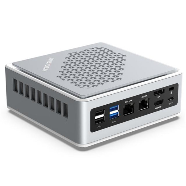 接口方面,这款迷你主机前面板配备了两个 USB 3.2 接口、一个雷电 4 接口、麦克风/耳机和电源按钮,而后面板搭载双 2.5GbE LAN 接口、HDMI、DP、2 个 USB 3.2 和 2 个 USB 2.0 接口。