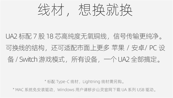 据了解,山灵 UA2 信噪比可达 121dB,内置低噪声 LDO 电源芯片,几乎零底噪。产品提供 3.5mm 单端以及 2.5mm 平衡接口,支持连接 Switch,并且可以在手机上通过 App 控制。