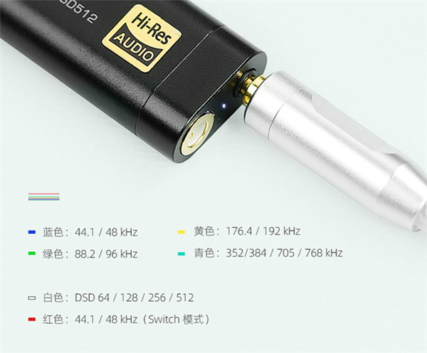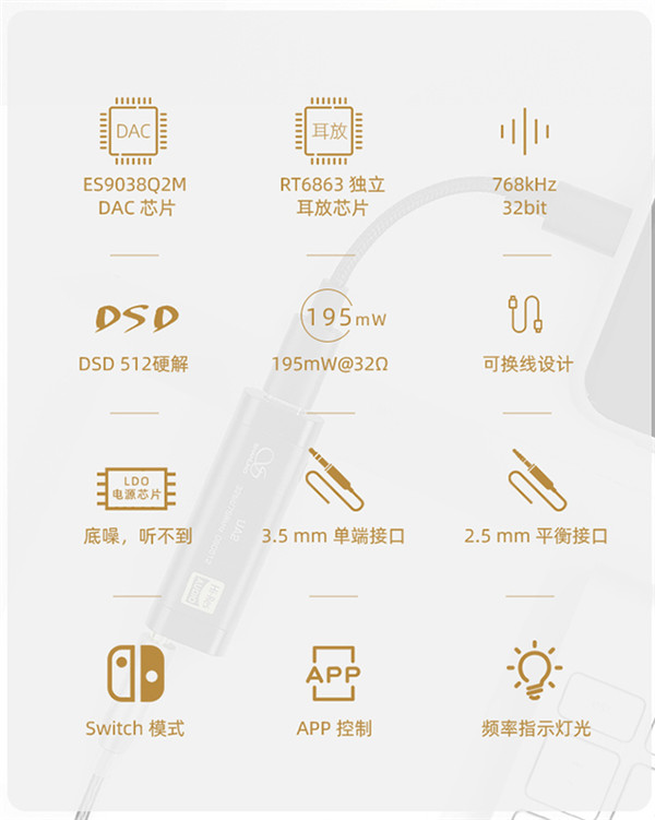 这款解码耳放采用可换线设计,支持使用 Lightning 转接线连接至 iPhone 等设备。产品搭载 ES9038Q2M 解码芯片,最高支持 768kHz 32bit 或者 DSD 512 硬解。产品具有 RT6863 独立耳放芯片,能够提供 195mW @32Ω 的大功率输出。