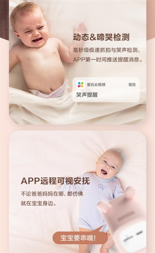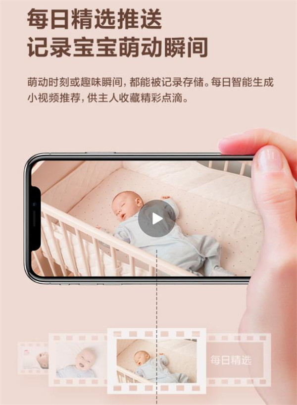 该设备拥有高解像力广角镜头,1080P 高清分辨率、F1.6 大光圈,画面明亮细腻;无红光,高清夜视,940nm 无红光夜视,不影响宝宝睡眠及视力。该设备还支持哭声检测,可在 App 第一时间推送消息,支持 PIR 自动人体感应抓拍与推送,7*24 小时全天候值守,对 PIR 人体感应的响应能力进行深度优化,唤醒抓拍速度可达到毫秒。极速抓拍异常情况,并推送 App 告警消息。