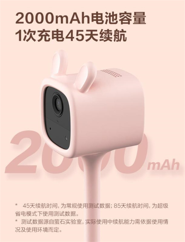 该设备拥有 2000mAh 不可拆卸锂电池,低功耗长久续航,配备多种省电模式,低功耗全天候值守。超级省电模式下,无预览操作下全天候待机门前守护,可持续待机长达 85 天。若每天捕捉异常与自动录像长达 5 分钟的情况下,可持续使用长达 45 天之久。