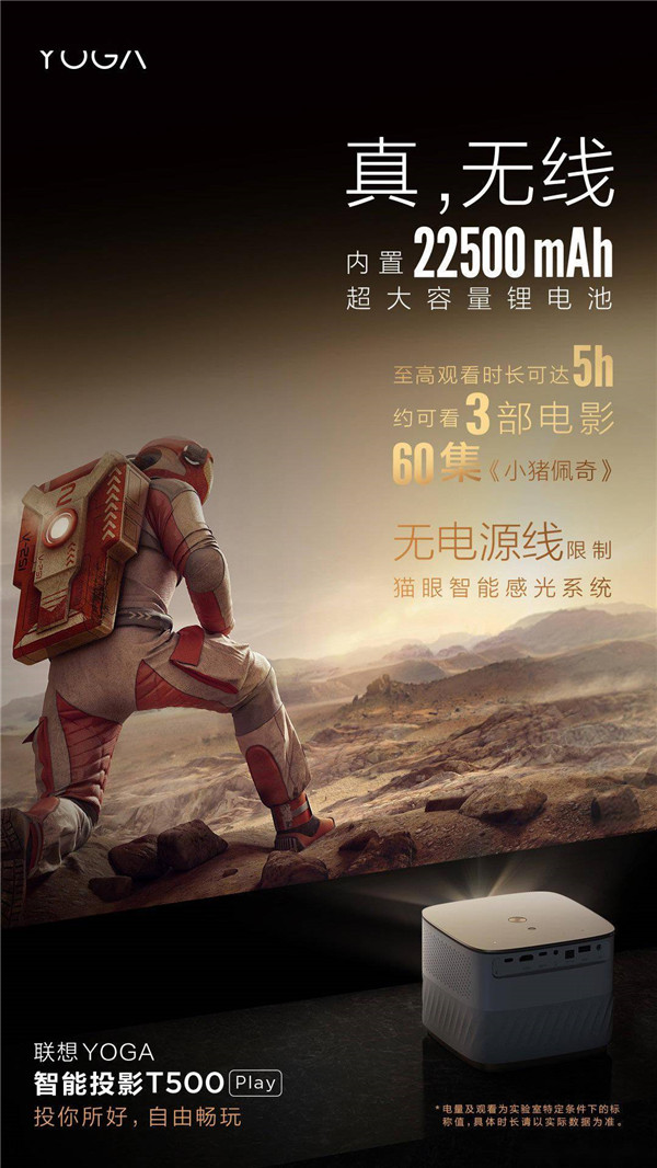据介绍,YOGA 智能投影 T500 Play 将配备 22500mAh 超大容量锂电池,至高观看时长可达5 小时,约可连续观看三部电影或 60 集《小猪佩奇》。此外,这款投影仪还搭载了猫眼智能感光系统。