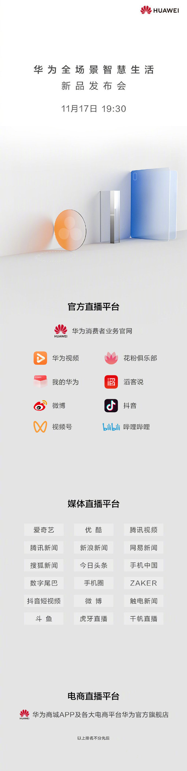 华为全场景智慧生活新品发布会将于11月17日19:30正式开始,距离现在只剩一天多时间了。在此次发布会上,华为将会推出几款重磅新品,包括主打运动健康的WATCH GT 3系列、采用口红式设计的华为FreeBuds Lipstick、二合一笔记本华为MateBook E以及为专业跑者设计的WATCH GT Runner,看点十足。那么,如何才能第一时间了解到这些新品的详细信息和售价呢,11月16日,官方公布了直播平台。