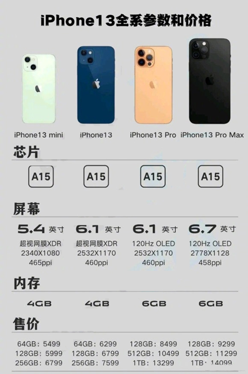 至于iPhone 13 Pro则是8499元起步,有128G(8499元)、512G(10499元)和1TB(13299元),iPhone 13 Pro Max是9299元起步,有128G(9299元)、512G(11299元)和1TB(14099元)。