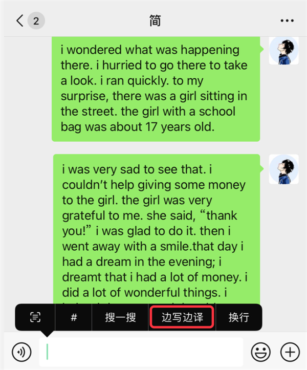 首先有朋友反馈称,自己的 iOS 微信更新后并没有「边写边译」功能,其实开通这个功能也非常的简单,我们只需要连续给好友发送几段英文就可以了,这样「边写边译」功能就会出现了。