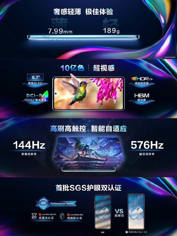其中摩托罗拉edge s pro被称之为“六边形战士”,采用了6.7英寸柔性OLED全面屏,支持10亿色显示,获得了SGS护眼双认证,刷新率为144Hz,触控采样率为576Hz。