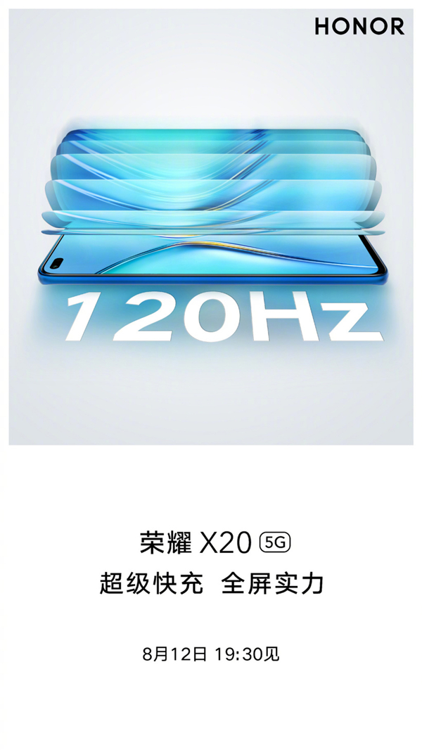 根据海报显示,荣耀 X20 手机搭载了 6nm 芯片(预计是天玑 900 芯片),支持 66W 超级快充,搭载 120Hz 全视屏。