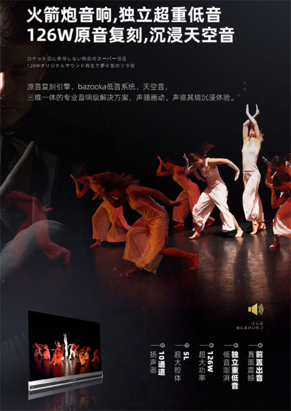 芝电视X9400F也将音质体验发挥到了极致。其搭载了东芝独有的火箭炮音响,通过“原音复刻引擎,bazooka低音系统,天空音”三维一体的专业音响真实还原人声,精准还原每个声音细节,输出充沛低音,全方位真实环绕感,带来声临其境的空间沉浸感。再加上杜比全景声+DTS V-X双音效,打造出最为丰盈的声音层次感和震撼效果。
