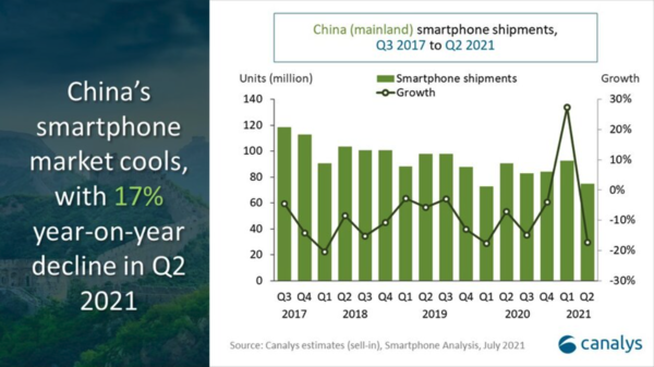 7月29日,市场分析机构Canalys发布了2026年第二季度的中国大陆智能手机出货量报告。数据显示,今年Q2中国智能手机出货量下降17%至7490万部,出货量超过1000万部的厂商数量从5家减少到3家。