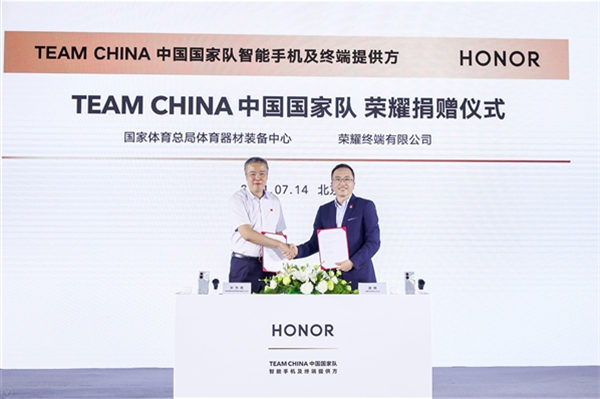 今日,荣耀携手国家体育总局装备中心在京举行捐赠仪式。荣耀作为TEAM CHINA中国国家队智能手机及终端提供方,为中国国家队提供了一批最新的智能终端设备,以高科技产品为中国国家队保驾护航。