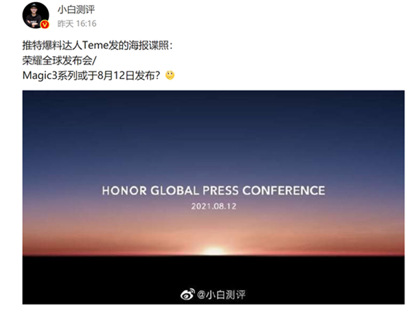 值得一提的是,推特上也有海外博主曝光了荣耀全球发布会的海报谍照,结合赵明的讲话看,很有可能指荣耀Magic3全球发布会,看来荣耀Magic3系列定档8月12日没跑了!
