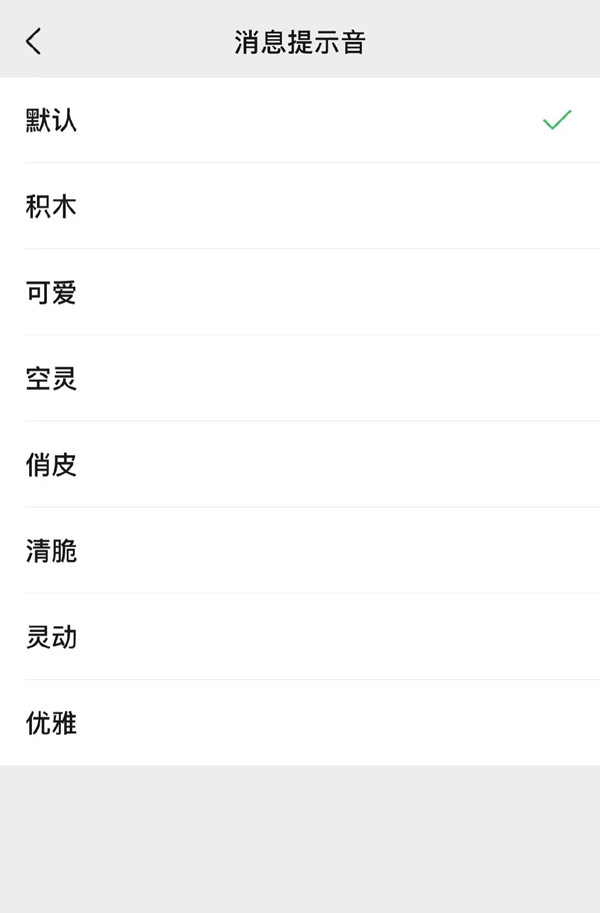 进入消息提示音,除了默认铃声之外,微信还提供了积木、可爱、空灵、俏皮、清脆、灵动、优雅共7种选择。