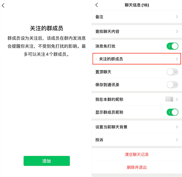 此次微信更新还新增了“关注群成员”功能,被设置消息免打扰的群,在关注个别群成员(最多四名)之后,这些人在群里的发言会提醒推送。