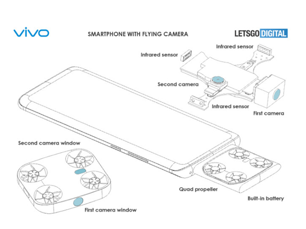 据外媒letsgodigital报道,vivo向世界知识产权局申请了一份带有飞行摄像头的智能手机专利。根据专利描述,vivo新型的手机专利,可让相机从智能手机上拆卸,然后飞行到空中,并且从空中的不同角度拍摄出创意的照片。