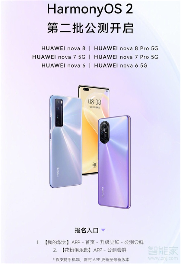此前,支持升级到HarmonyOS 2的手机包括华为Mate40系列、P40系列、Mate30系列以及MatePad等产品。6月16日下午,HarmonyOS 2开启了第二波升级公测,支持更多机型升级,包括nova 6系列、nova 7系列以及nova 8系列共计6款机型。报名入口可以从“我的华为”APP进入,然后点击首页的“升级尝鲜”-“公测尝鲜”;或是进入“花粉俱乐部”APP,然后点击“公测尝鲜”。