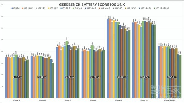 这么说并非无中生有。有位博主找来了iPhoneSE、iPhone 6S、iPhone 7、iPhone 8、iPhone XR、iPhone 11和iPhone SE 2等7款机型,对比了在iOS 14.6正式版与iOS 14.5.1正式版下GeekBench电池续航测试的情况。