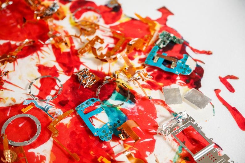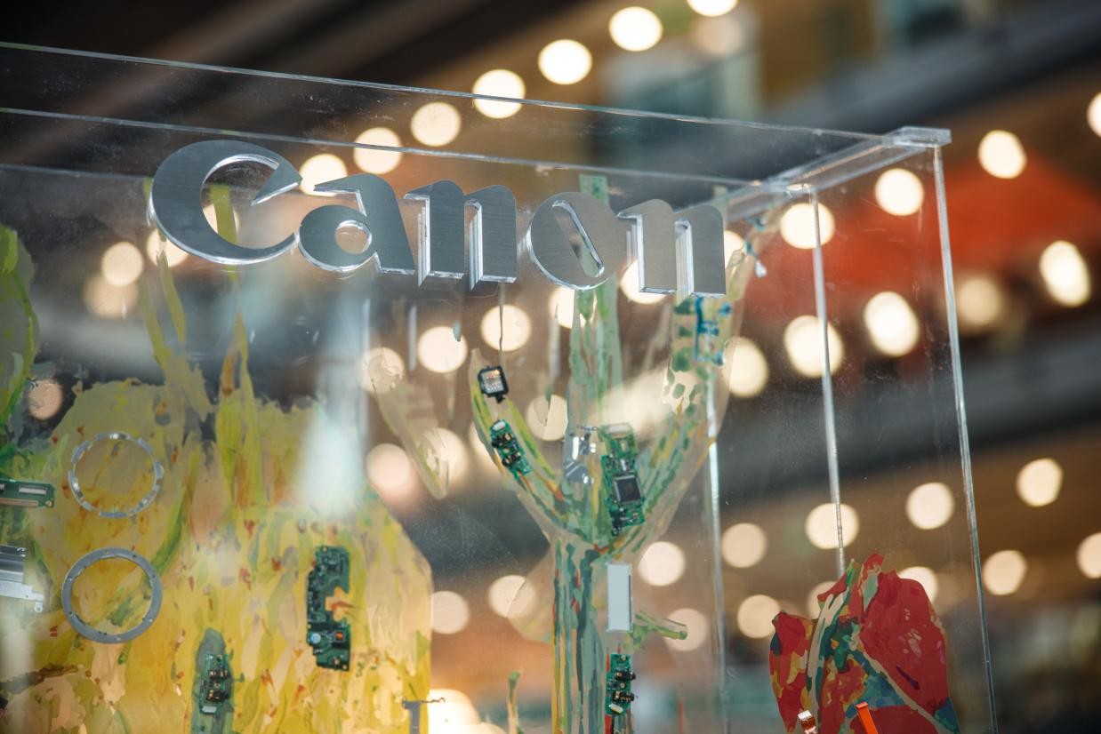 在创作过程中,康蕾老师表示:“我的第一台相机就是佳能相机,以往都是用相机去拍摄和记录外部的世界,这是第一次有机会近距离的了解相机的内部结构,有了全新的认识角度,发现整个佳能相机本身就是一件艺术品,里边的各种金属机械零件和反光折射的镜片特别的精致精美,材料质感不同,颜色和形状也都不一样,带来很多创作灵感 。 ”