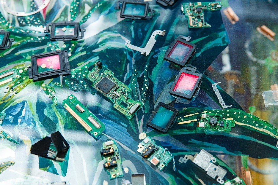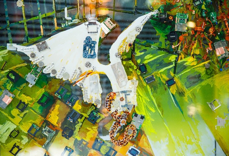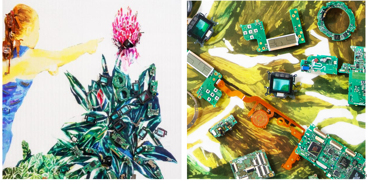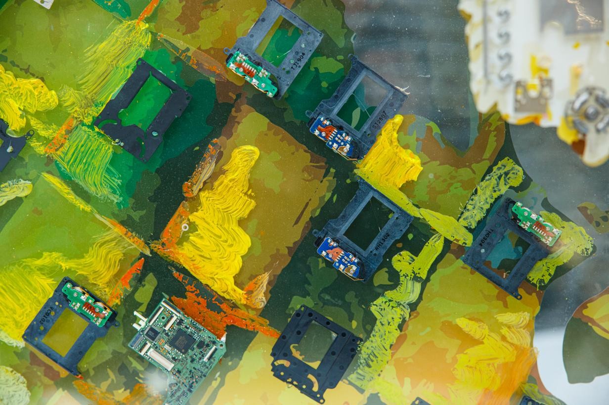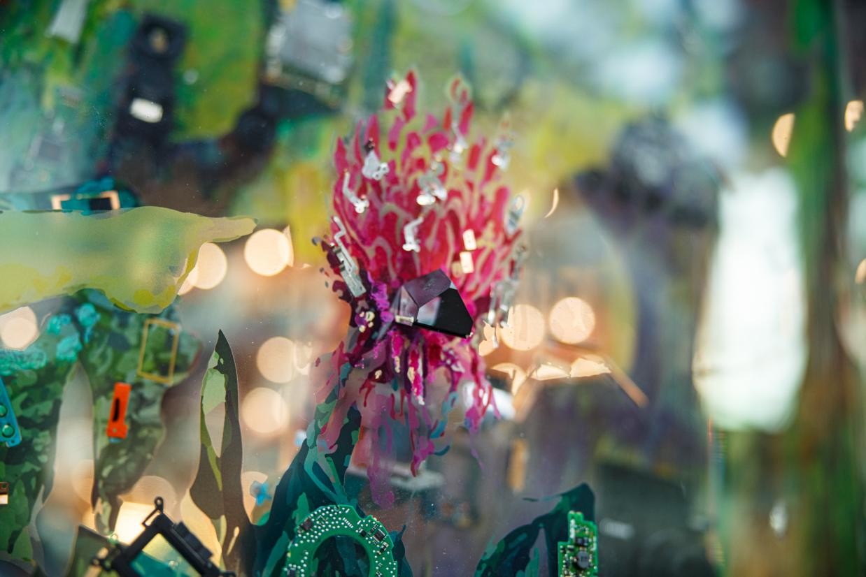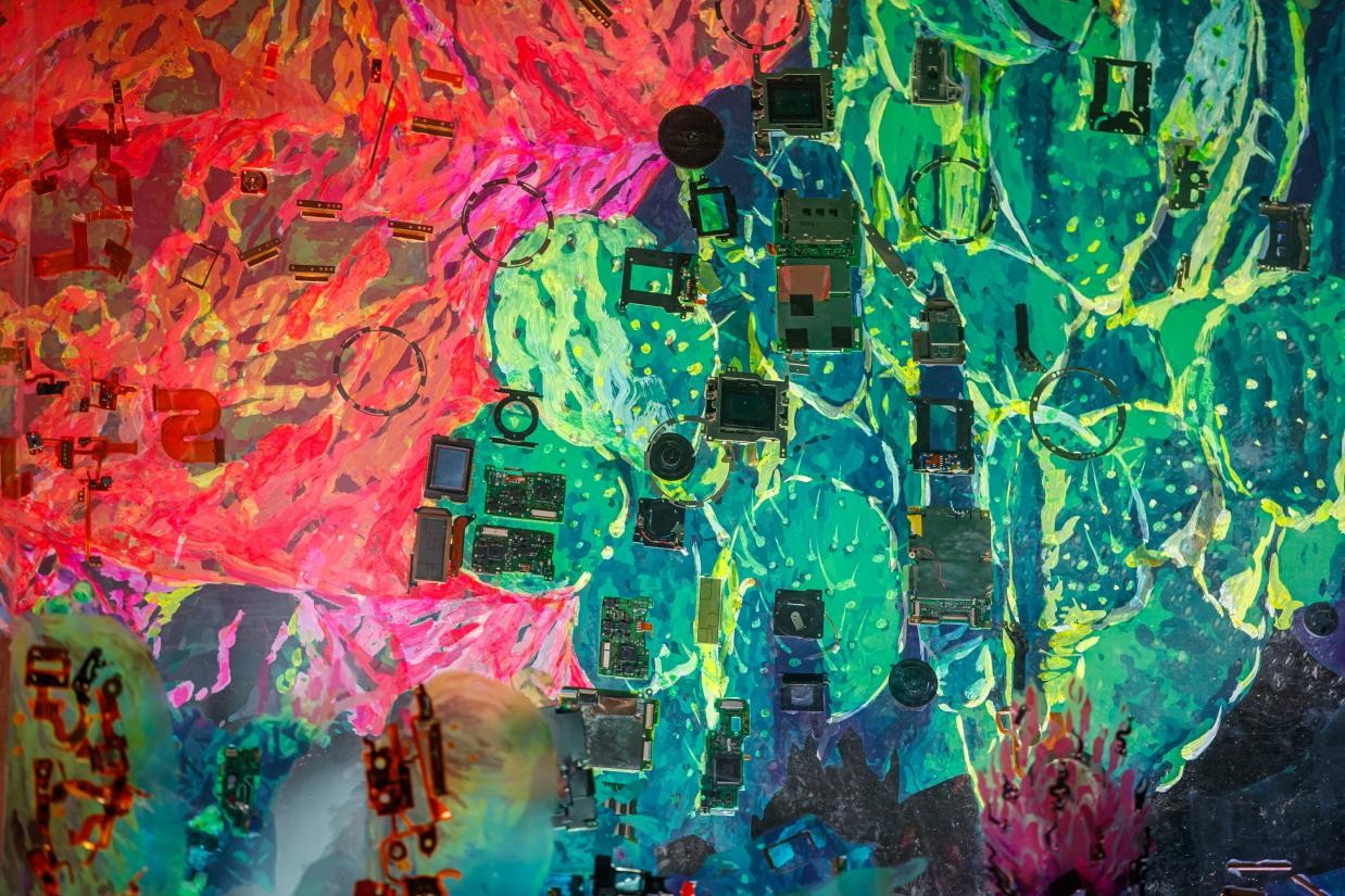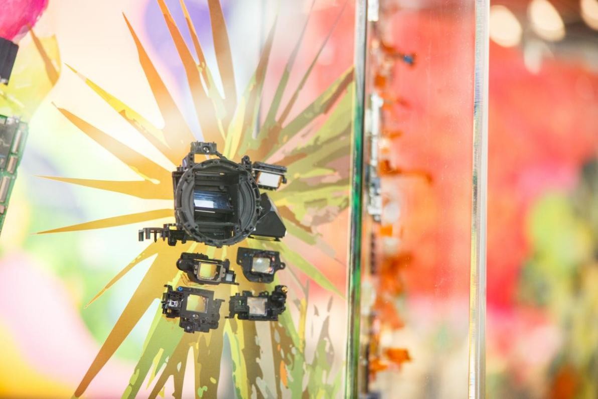 画面本身由丰富的视觉元素构成,颜色与线条勾勒出生动的生物与建筑景观;以此为基础,艺术家使用相机内部的金属垫片等材料对图像进行了跨媒介的处理,传递强延展性的视觉讯息:颜料与手绘感性、充满温度,象征浪漫壮阔的生命与自然;传感器、翻转屏等零件以其自身的数学性和严谨的工业设计,提示科学技术之于人类文明的重要意义。