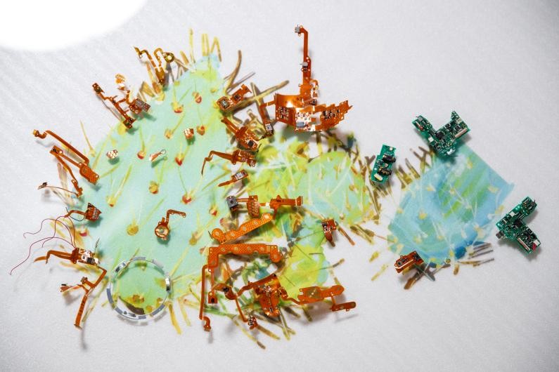 康蕾老师还表示:喜欢这种创作中的发现与不确定性,探索艺术与科技结合的新的表达可能性。通过将这些佳能相机零件与作品中各种植物的生长形态相结合,为整个艺术装置提供了精密金属所带来的科技感与立体性。零件以其金属本质与精密的工业设计,将艺术延伸至日常生活与艺术创造中,“植物”“生态”“科技”三者有了全新的结合方式,是一次很重要的艺术尝试。