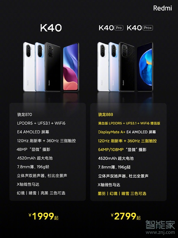 作为旗舰手机,Redmi K40功能也非常齐全,杜比双扬声器、X轴线性马达、IP53级防水、全功能NFC、红外遥控、wifi6等主流配置一个都不少。定价方面,K40:6GB + 128GB,1999元;8GB + 128GB存储2199元,8GB + 256GB存储2499元,12GB+256GB存储2699元(首批2499元)。K40 Pro:6GB + 128GB存储2799元,8GB + 128GB存储2999元,8GB + 256GB存储3299元。K40 Pro+只有12GB + 256GB一个存储规格,3699元,3月25日开售。