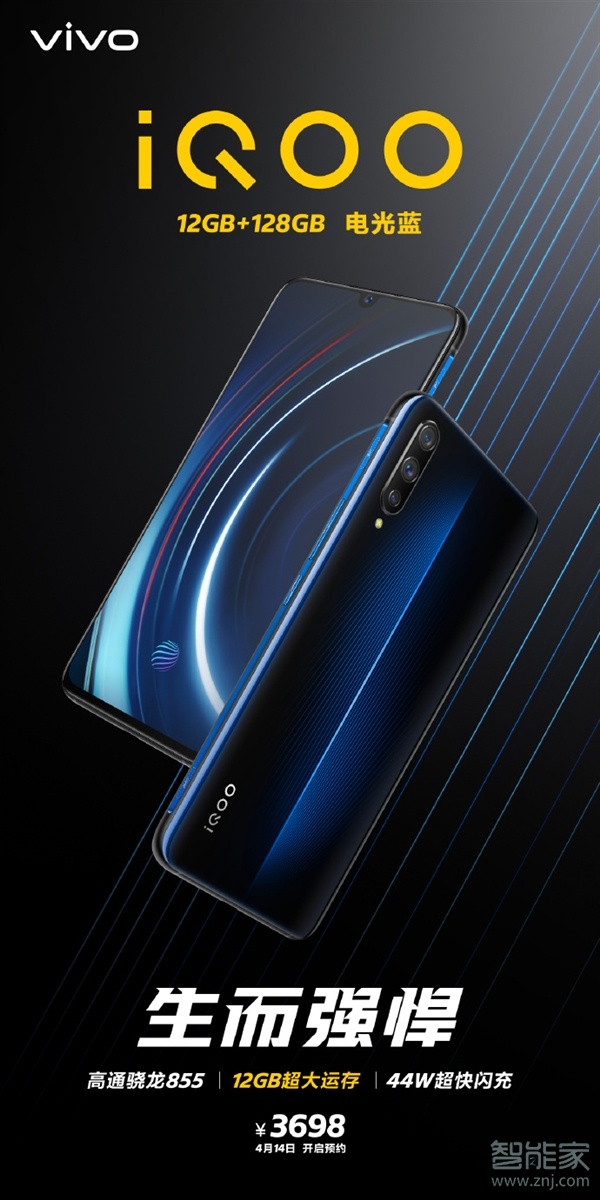 4月12日,iQOO官方宣布全新配置的iQOO手机12GB+128GB电光蓝版本将在两天后开启全网预约(4月14日开启预约),售价3698元。