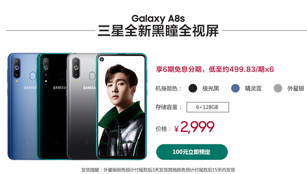 三星a8s正式开启预售三星a8s目前在三星官网、天猫旗舰店、京东旗舰店、苏宁旗舰店开启了预售,售价都是2999元。除官网之外,天猫、京东、苏宁都是100元抵200元预定,最终到手价为2899元,所以如果想要买这款手机的朋友要抓紧时间预定更划算。