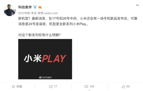 日在微博放出一张图片,并附文案“新机型?最新消息,在17号和26号中间,小米还会有一场手机新品发布会,可靠消息是24号圣诞夜,机型是全新系列小米Play。”