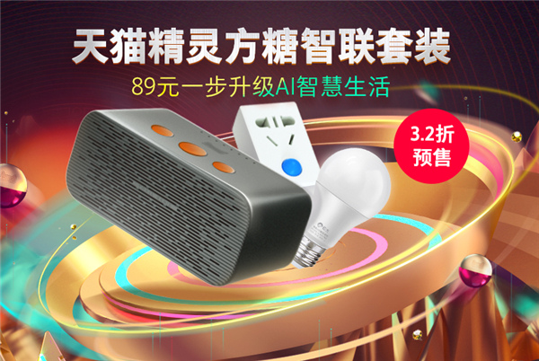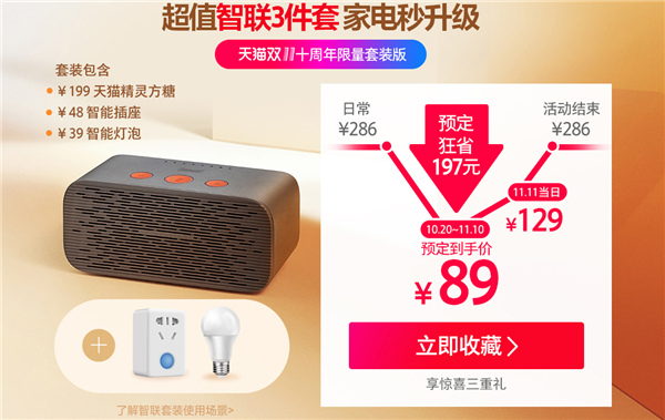 这次的超值智联三件套包括价值199RMB的天猫精灵方糖、价值48RMB的智能插座和价值39RMB的智能灯泡,预订价格只需要89元。