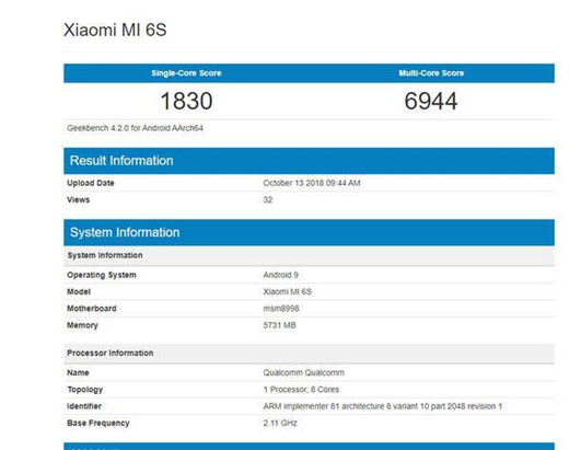 近日,一款型号为小米6s的机型在Geekbench中现身,或为小米6的升级版机型,GeekBench检测信息显示,小米6S配备了一颗骁龙845处理器,一起来看看吧。
