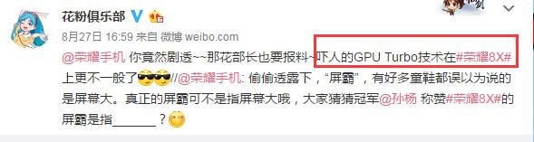 据花粉俱乐部在微博上的爆料信息,8x系列其中一款机型将会支持GPU Turbo技术,估计会是荣耀8xmax