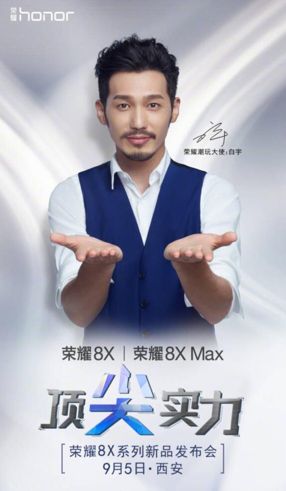 荣耀8x系列发布时间确认!大家翘首以盼的荣耀8x系列现在又来了新消息!荣耀 8X 和荣耀 8X Max 将于 9 月 5 日正式发布,官方也正式宣布演员白宇成为“荣耀潮玩大使”。