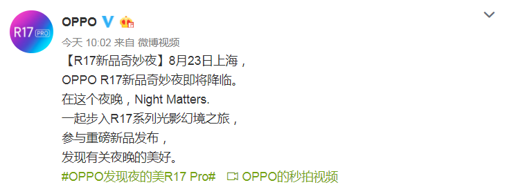 oppor17pro什么时候发布?oppo官方暂未公布oppor17pro的发布时间,鉴于️opopr17将于8月23日在上海发布,那么oppor17pro应该也是在这个时间一起发布。