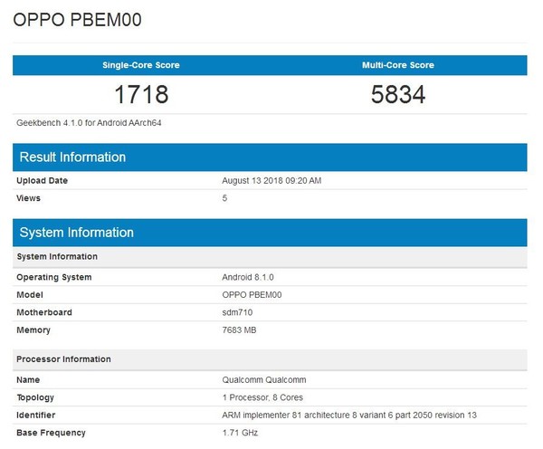 日前,我们在移动芯片跑分平台Geekbench上发现了一款型号为“PBEM00”的OPPO神秘新机。该机昨天在平台上测试了多次,从配置信息看,搭载了骁龙710+8GB的性能组合,运行Android 8.1.0系统。单核成绩和多核成绩分别为1700分和5800分左右,作为对比,骁龙845的单核和多核成绩约为2400分和9000分。这款手机应该就是oppor17pro。