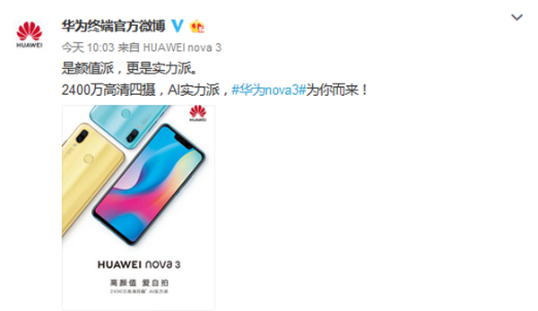 刚刚华为官方微博发出华为nova3手机的海报,如图: