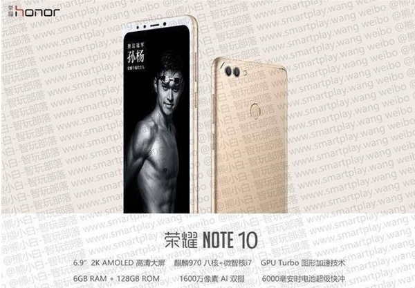 根据昨天曝光的海报信息,荣耀Note 10配备了6.9英寸2K AMOLED显示屏,搭载麒麟970+微智核i7处理器,搭配6GB RAM+128GB ROM,后置1600万像素AI双摄,6000mAh电池容量,支持超级快充,支持GT图形加速技术。