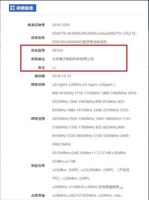 近日,锤子科技一款型号为OE103的新机已经获得了无线电发射型号核准,具备全网通功能,预计将于今年八月份与我们见面。虽然暂时还没有该机其他的信息,但从过去坚果PRO的手机型号OD103来推测,OE103或有可能便是即将发布的坚果PRO3。
