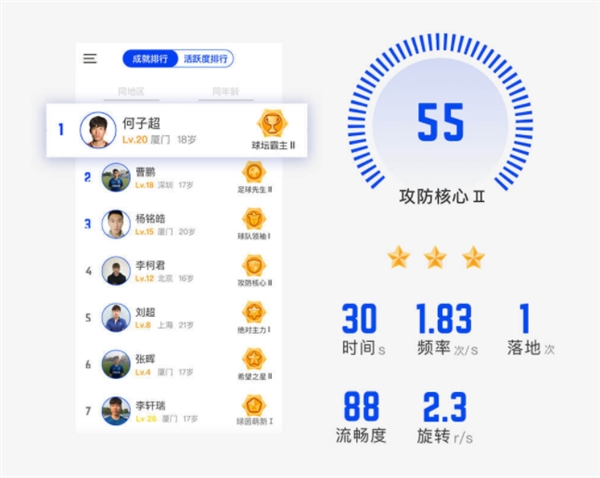 同时APP设置3个等级14项进阶式练习项目,系统可对每项练习达标情况进行评分。还有个人成就排行榜,跟高手在线PK。