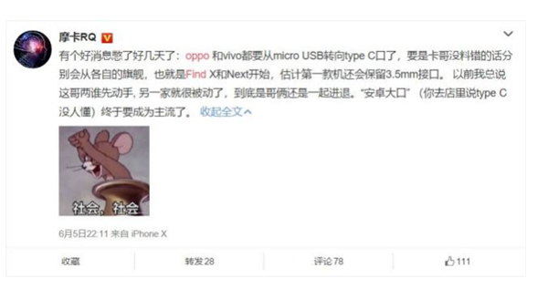 虽然OPPO Find X无缘超级VOOC闪充让人失望,但该机将改用Tybe-C接口的消息还是得到了证实。按照业内人士@摩卡RQ在微博上的说法,OPPO和vivo都要从micro-USB转向typeC接口,并且会从各自的旗舰机型也就是OPPO Find X和vivoNEX开始,估计第一款产品还会保留3.5mm耳机接口。