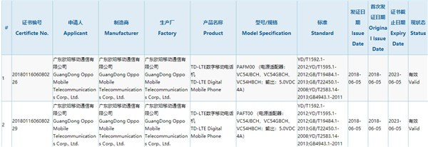 同样型号的两个OPPO手机型号也已经通过了3C认证。页面上的信息显示,该机的充电器支持20W快充。