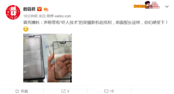 略有遗憾的是媒体们并未爆出真机照片,不过网上已经流出疑是荣耀Play的前面板照片,照片显示荣耀Play采用的是刘海屏,四周边框非常窄,屏占比很高。所以不排除荣耀Play的解锁方案除了常规的后置指纹,还可能选择搭载屏下指纹或是采用3D结构光的人脸解锁。