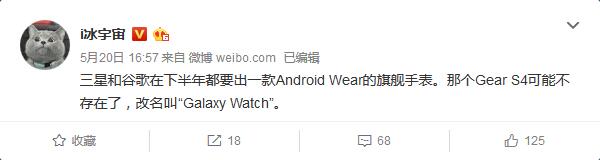 今天下午多次爆料三星新设备的@i冰宇宙爆料称,三星和谷歌都会在下半年推出全新的基于安卓系统的智能手表,其中三星的智能手表名字称之为Galaxy Watch,也就是说Gear S4可能将不复存在。