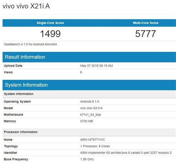 vivo X21iA跑分现身 搭载联发科P60处理器近日,Geekbench跑分网站又泄露了一款型号为vivo X21i A手机的跑分信息,从该跑分信息中我们可以看到,该机搭载了联发科P60处理器,采用了6GB运行内存,运行Android 8.1系统。该机的单核跑分为1499,多核跑分5777,据推测,这款机器应该为vivo X21的联发科P60处理器版本。